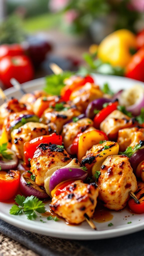 These grilled chicken kabobs are marinated in a blend of Middle Eastern spices, resulting in a taste that is bold and aromatic. Each bite offers tender chicken pieces that are juicy and packed.