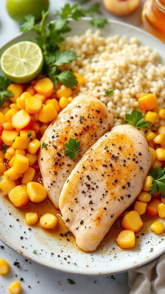 Picture a honey lime chicken bowl, perfectly succulent and paired with a colorful grilled peach and corn salad. This combination not only pleases the palate but also turns your dinner plate into a visual masterpiece.